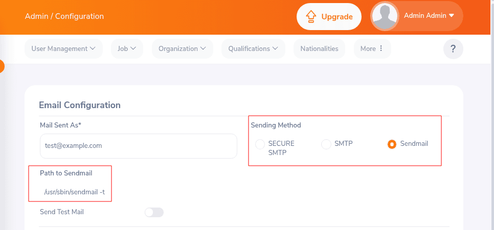 - A properly installed and configured version of sendmail is required. According to the GitHub issues, the Ubuntu sendmail package does not work properly with the -bs parameter. See here: https://github.com/orangehrm/orangehrm/issues/1734 This setting can only be changed via database access. Additionally, sendmail must be selected as the active mail component for sending emails. This setting can be configured by administrative accounts within the application.